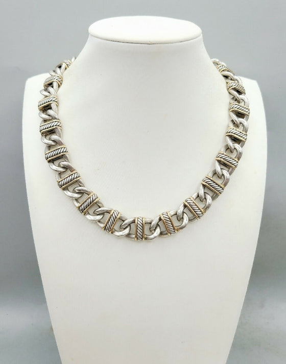 From the Madison Link Collection, this bold necklace features sterling silver links accented with 18k gold, measuring 14 mm wide and 16" long. Secured by a classic box clasp, it is a rare vintage design that reflects David Yurman’s signature artistry in combining strength, luxury, and timeless style.