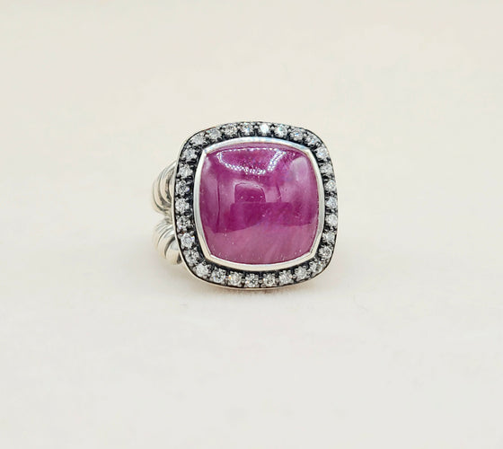 From the Moonlight Ice® Collection, this Albion ring showcases a richly colored 14×14mm cabochon ruby framed by 0.45 carats of pavé diamonds. Crafted in sterling silver with black rhodium, the bold 19mm top makes a striking statement while maintaining Yurman’s refined elegance. Offered in size 6.5, this retired design is both rare and highly collectible, making it a standout in David Yurman’s gemstone artistry.