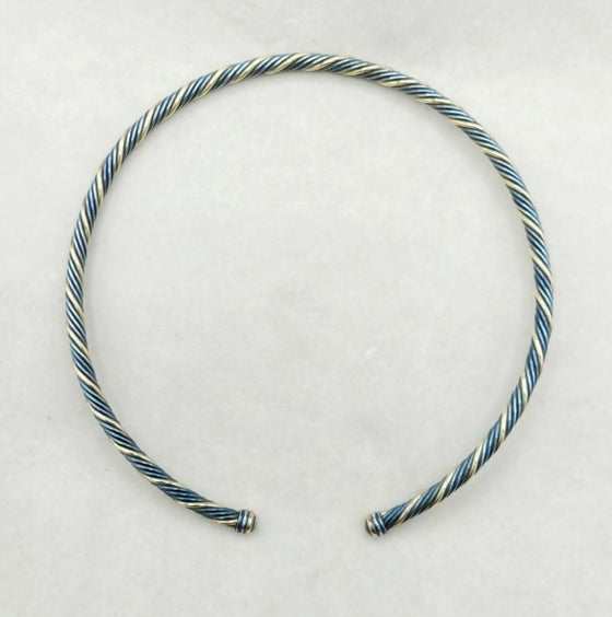 From the iconic Cable Collection, this rare collar necklace features a bold 5 mm design crafted in darkened sterling silver with 18k gold accents. Measuring 15.5" in inner circumference and adjustable for a comfortable fit, it is an extremely rare and collectible piece that exemplifies David Yurman’s signature artistry in blending sculptural cable design with luxurious precious metals.