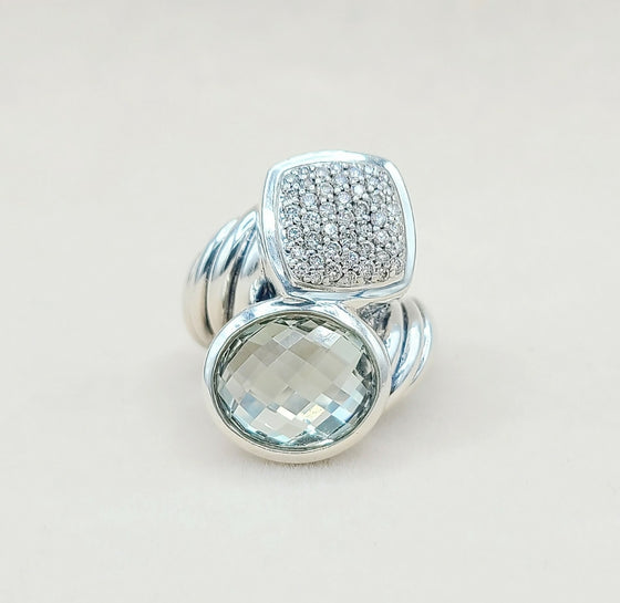 From the Bypass Collection, this exquisite ring features a faceted 11 × 9 mm prasiolite accented with 0.69 carats of pavé diamonds. Crafted in sterling silver and sized at 6.5, it embodies David Yurman’s signature elegance with a modern twist. Extremely rare and highly collectible, this ring makes a sophisticated statement piece.
