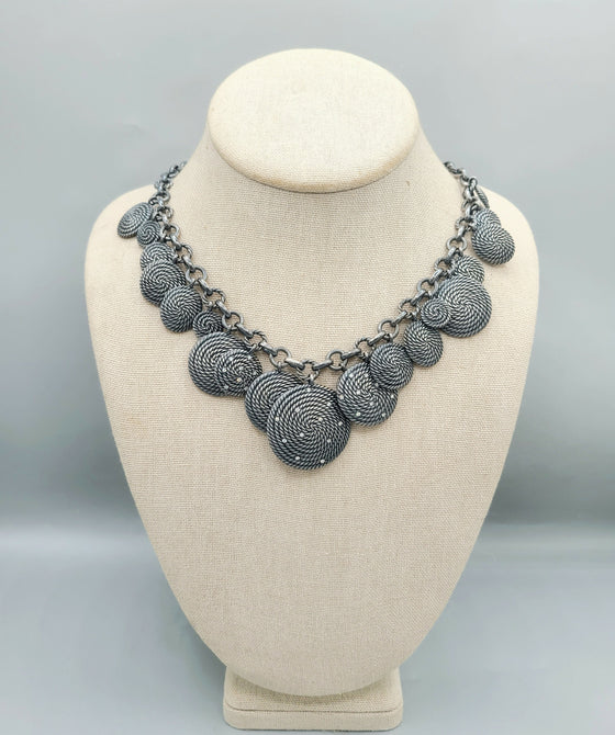 This Coil Charm Necklace is a bold and artistic Yurman design. Crafted from darkened sterling silver, it features four graduated circular charms—12mm, 15mm, 18mm, and 33mm—set with 0.57 carats of pavé diamonds. The necklace secures with a toggle clasp and offers adjustable lengths of 18", 19", and 20". Very rare and highly collectible, this piece is a striking example of David Yurman’s modern elegance and sculptural craftsmanship.