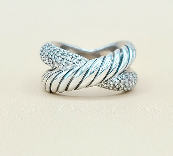 From the Crossover X Collection, this striking ring features 0.60 carats of pavé diamonds set in sterling silver. Measuring 12 mm at its widest point and sized at 7, it combines Yurman’s iconic crossover design with a bold yet elegant presence. Rare and collectible, it is a timeless piece that embodies both sophistication and craftsmanship.