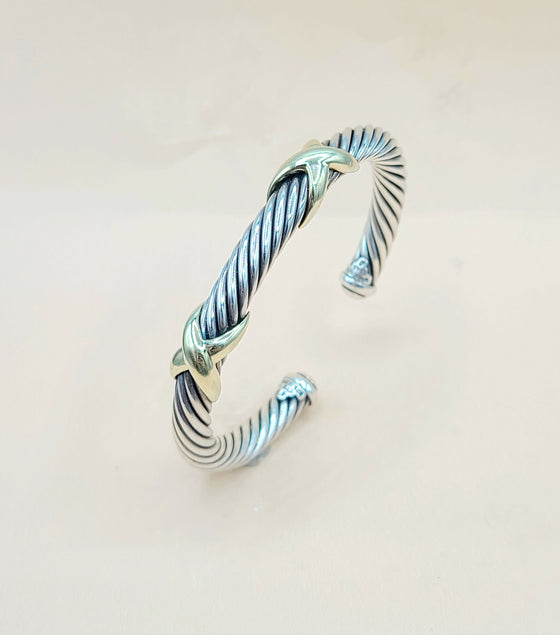 The X collection is one of David Yurman’s most enduring designs, symbolizing unity and connection. This 7mm sterling silver cable bracelet, accented with 14k gold double X stations, balances bold style with timeless elegance. Rare and collectible, it makes a versatile addition to any jewelry collection.