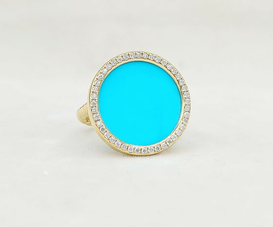 From the Elements Collection, this bold ring showcases a vibrant turquoise center accented with 0.29 carats of pavé-set diamonds, all crafted in solid 18k yellow gold. Measuring 21 mm across the top and sized at 7, it blends striking color with timeless elegance. Like new and highly collectible, this piece exemplifies David Yurman’s artistry in creating refined statement jewelry.