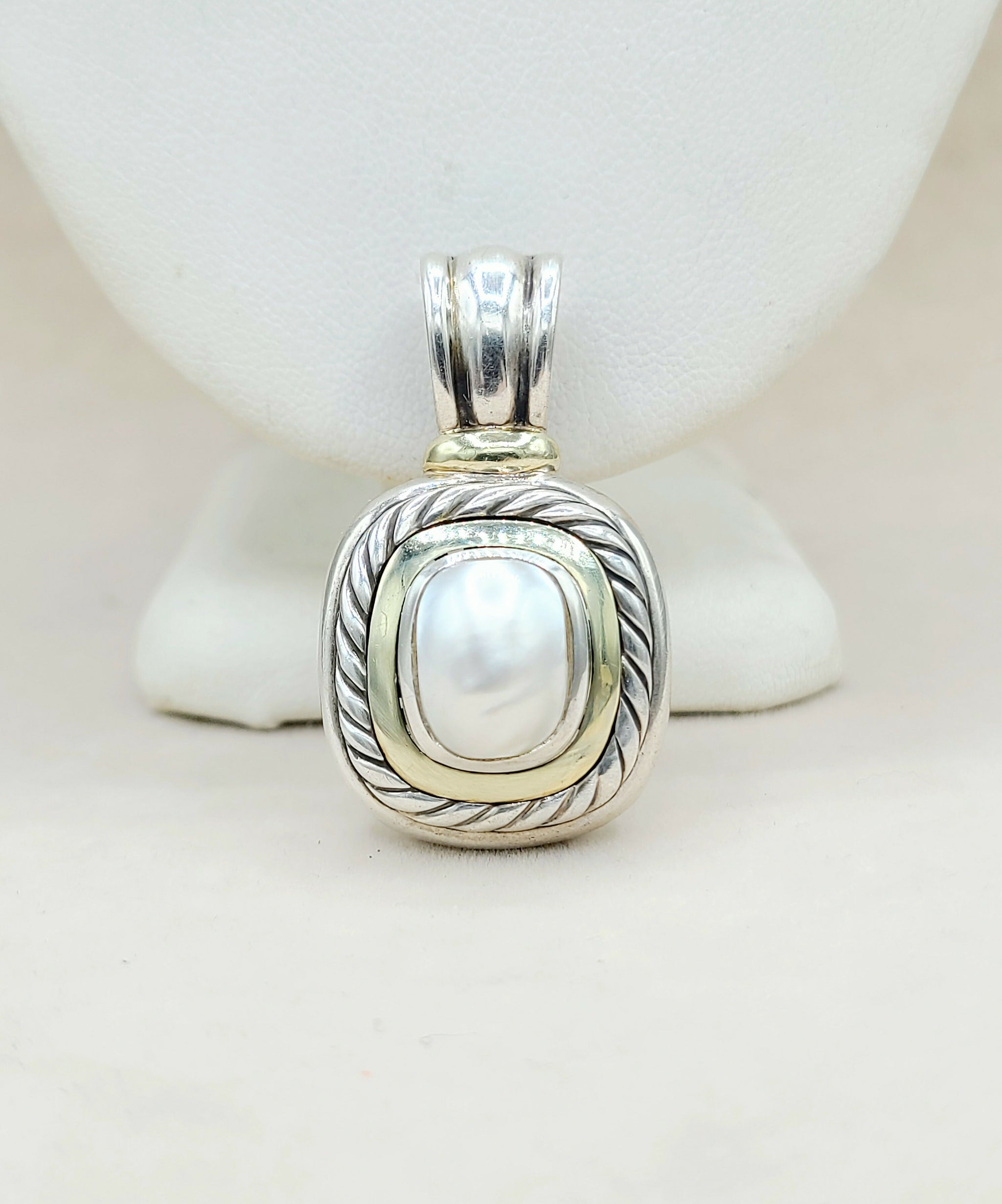 From the Albion Collection, this large pendant enhancer features a luminous 12×10mm cabochon mabe pearl set in sterling silver with rich 14K gold accents. Measuring 40×22.6mm, its hinged bail opens to accommodate chains up to 8mm, offering versatile wear. Rare and elegant, this Albion design highlights Yurman’s artistry in pairing unique pearls with bold, sculptural settings.