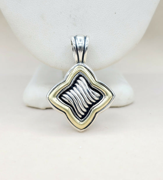 From the Thoroughbred Collection, this large quatrefoil pendant enhancer is crafted in sterling silver with 18k gold accents. Measuring 39 × 28 mm including the bail, it features a hinged clasp for secure versatility. A vintage and retired design, it is highly collectible and pairs beautifully with its matching earrings, making it a rare find for any David Yurman collector.