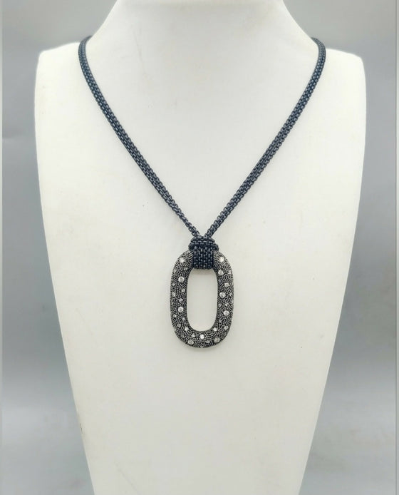 From the Midnight Melange Collection, this rare necklace features a dramatic 36 × 23 mm pendant in darkened sterling silver, accented with 0.72 TCW of pavé diamonds. Suspended from a 20" sterling silver chain with a secure lobster clasp, it is both bold and sophisticated — a collectible example of David Yurman’s signature artistry in combining texture, contrast, and gemstone brilliance.