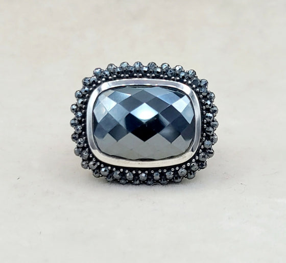 From the Osetra Collection, this bold ring highlights the beauty of hematite, featuring a 17×13 mm faceted stone paired with a rose-cut hematite accent. Measuring 26×22 mm at the top and sized 7, it is rare and collectible, showcasing David Yurman’s artistry in blending distinctive gemstones with sculptural sterling silver design.