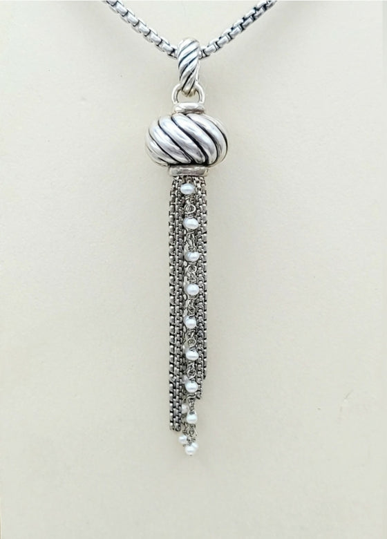 From the Sculpted Pearl Tassel Collection, this pendant enhancer features white freshwater pearls set in sterling silver. Measuring 3" (75 mm) long and 15 mm wide with a hinged bail, it is rare and collectible, showcasing David Yurman’s signature artistry in combining sculptural design with luxurious gemstones.
