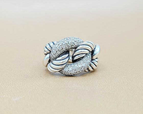 From the Belmont® Collection, this wide curb link ring embodies bold sophistication. Crafted in sterling silver and set with 1.03 carats of pavé diamonds, the design measures 17mm at its widest point, making a striking statement on the hand. Offered in size 8, this rare piece combines contemporary edge with Yurman’s timeless craftsmanship, making it a highly desirable collector’s ring.
