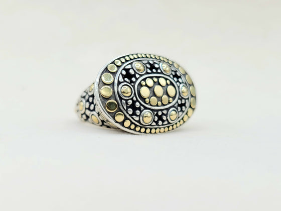 The Jaisalmer Dot Dome Ring reflects John Hardy’s signature craftsmanship, blending intricate sterling silver with warm 18k gold accents. With a bold 29 × 19 mm top and a comfortable size 6.5 fit, this piece captures the elegance and artistry of the Jaisalmer collection. A rare find, it makes a striking statement for any jewelry collection.